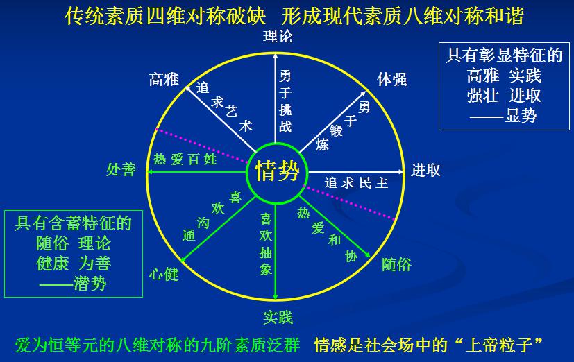 在势科学与信息动力学视阈中,教育、管理等在科学本质上是一个用“差别×联系即差别÷距离”求导的过程,教育是对思维求导,在思维过程中构建巨大的知识“差别”,建立紧密“联系”,从而使思维产生张力,建立思维过程中的信息强势,推动思维的有序、相变和分岔,产生创新。教育过程的本质是生产有效信息量营造教育信息势。在信息化社会强烈的信息博弈竞争中,人才的素质结构在“差别促进联系,联系扩大差别”的信息作用机制的推动下,从传统的四维对称激化嬗变为“八维对称化素质”(见图二),而以对称化教育培养对称化素质,则是现代社会参与全球化人才竞争的根本战略。